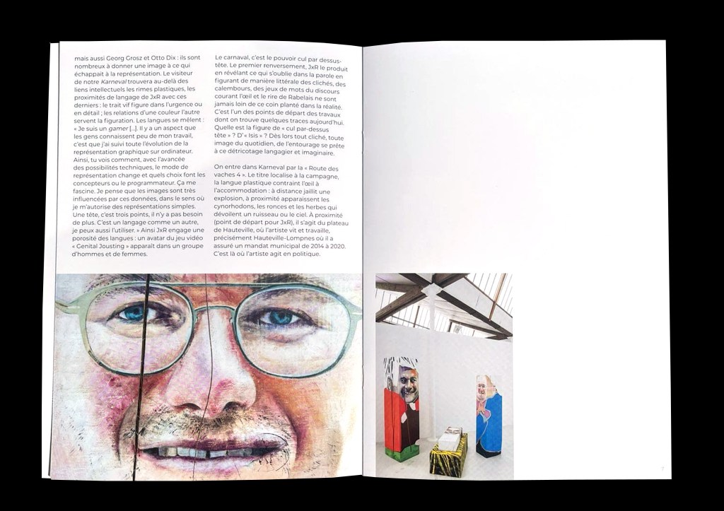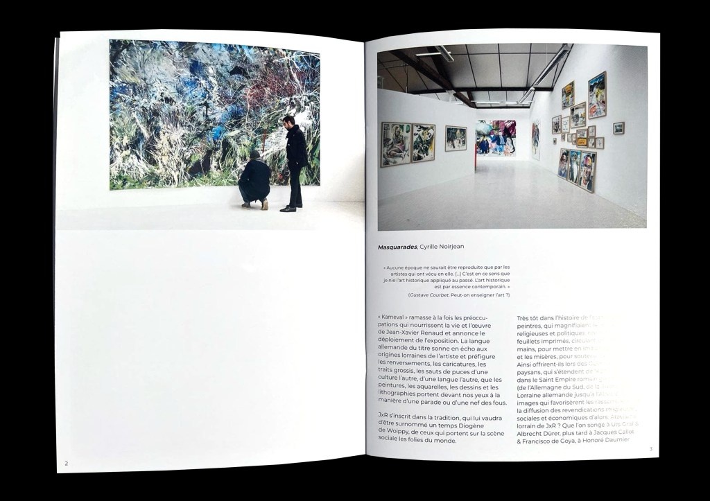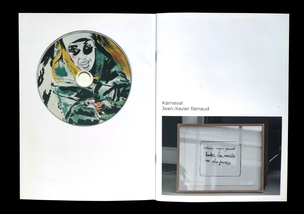 Conception d’un livre à l’occasion de l’exposition Karneval de l’artiste Jean-Xavier Renaud à URDLA, centre d’art contemporain. Archive entremêlant prises de vues de l’exposition, texte et CD du concert tenu à l’occasion du vernissage de l’exposition.
