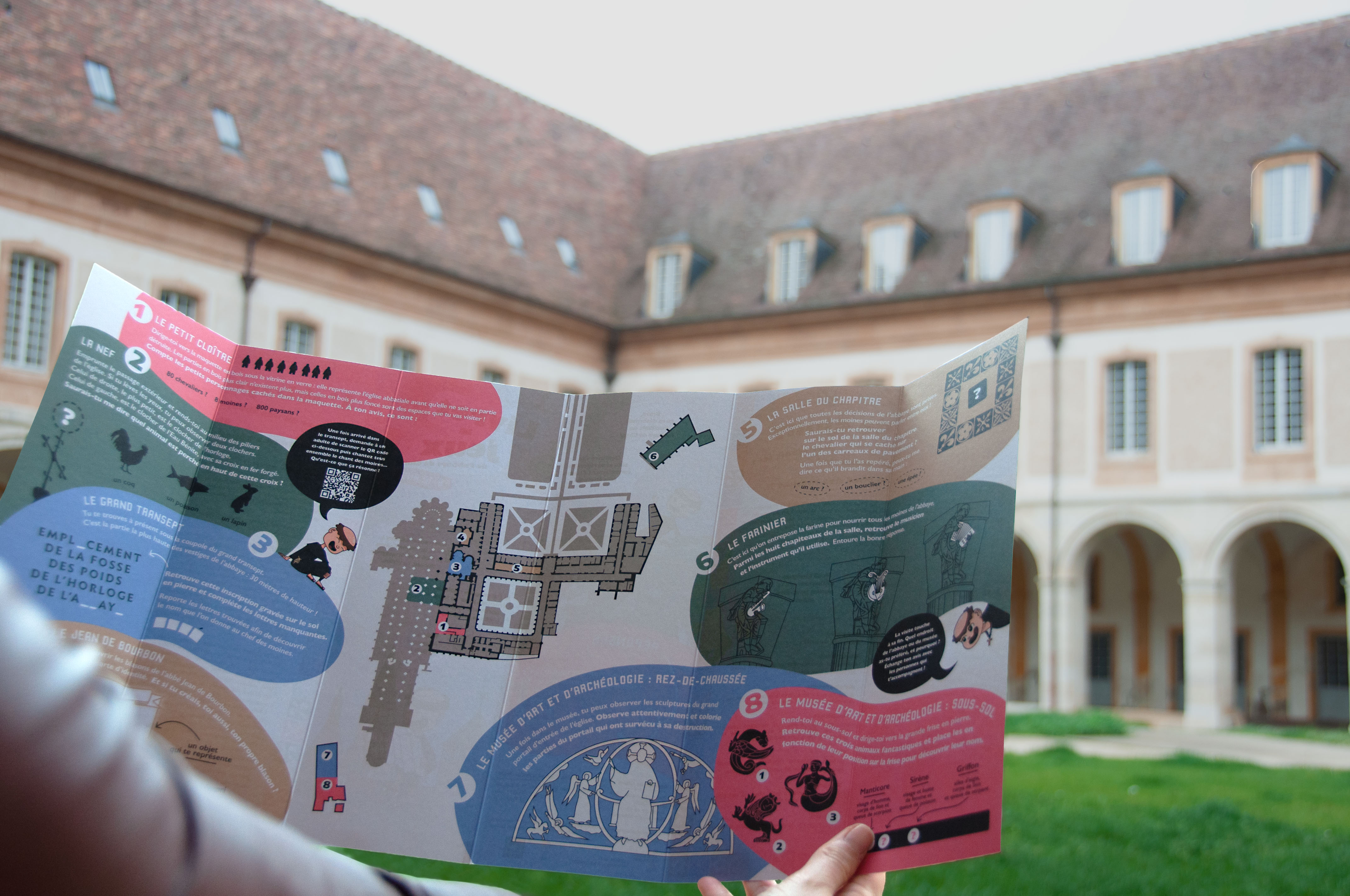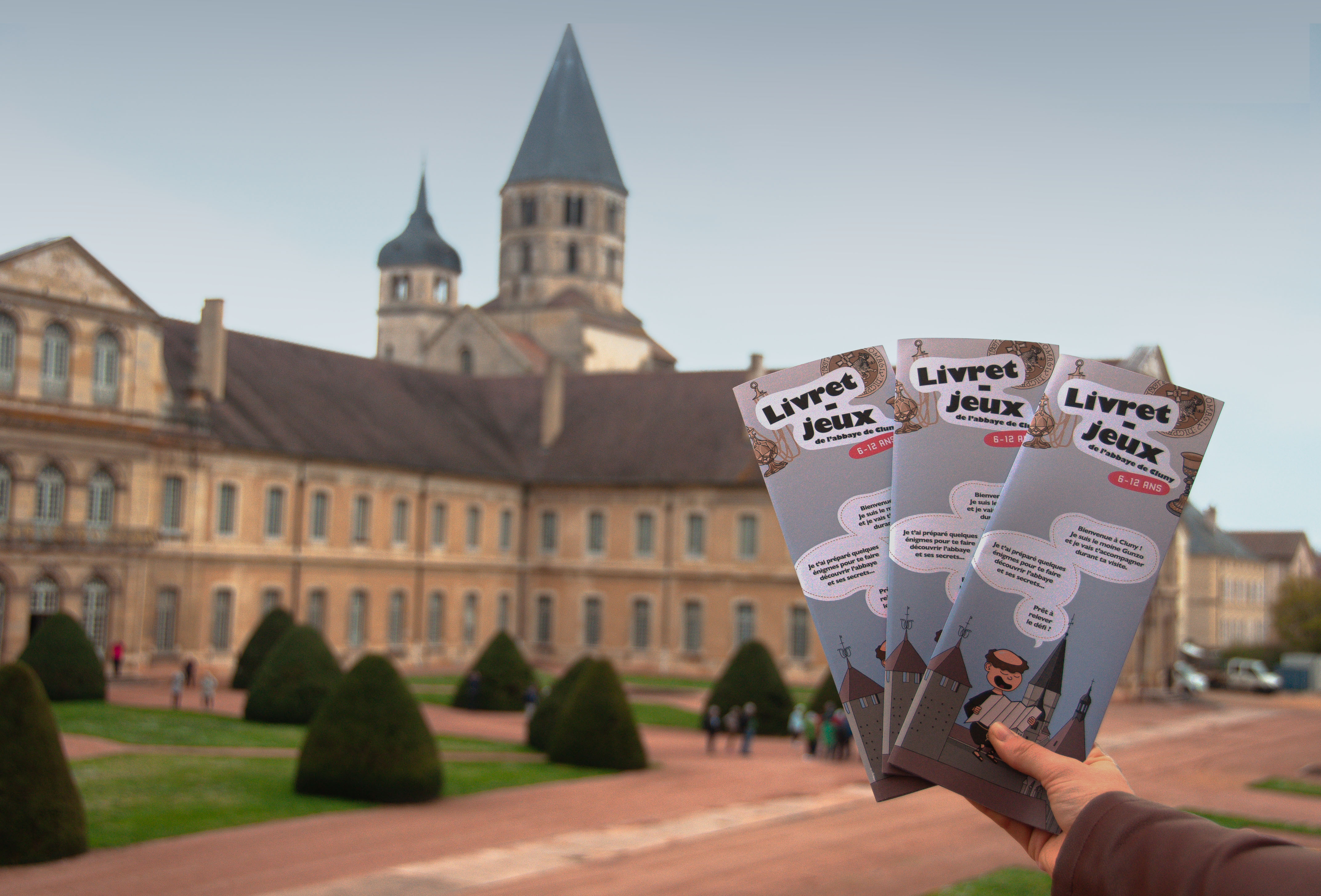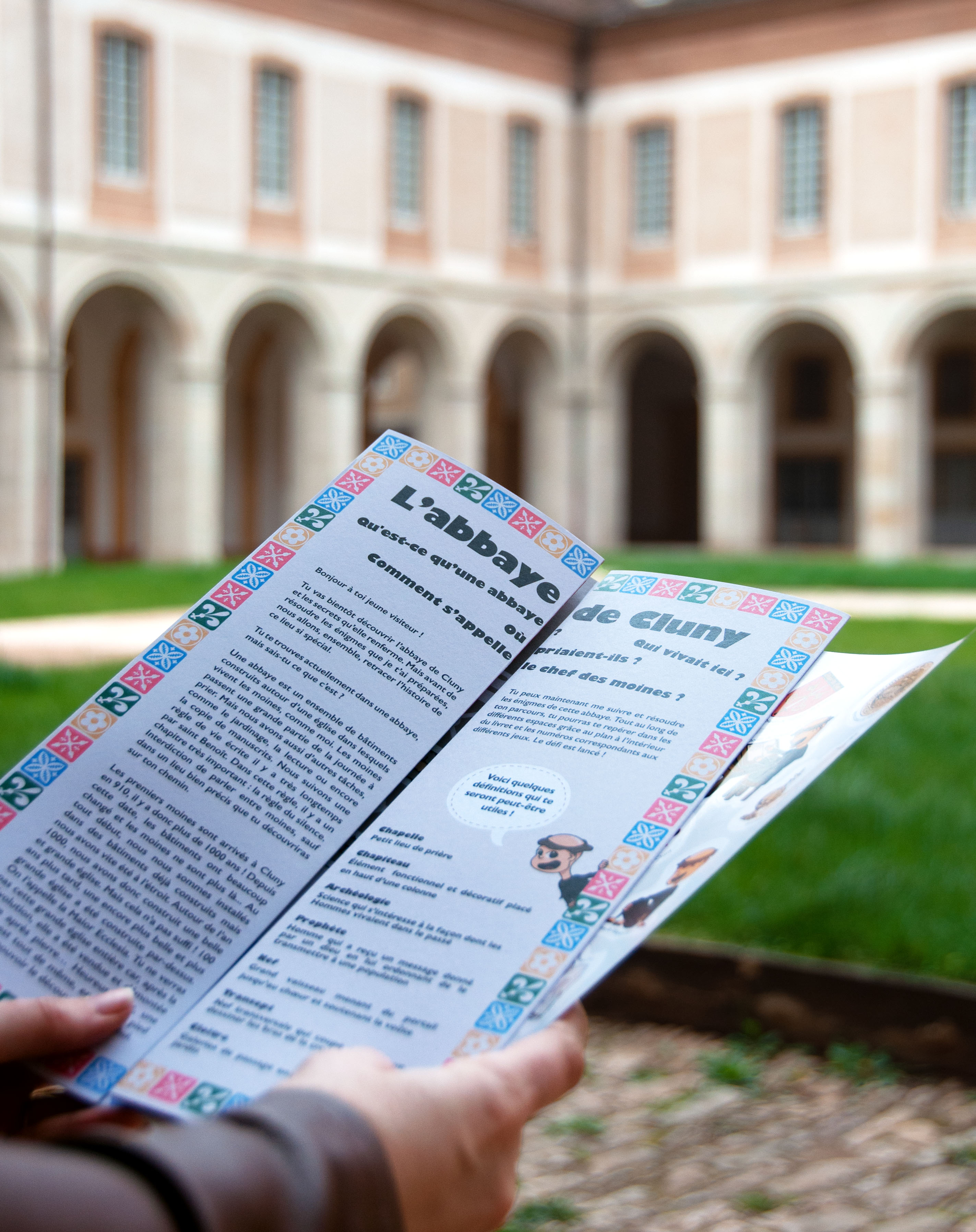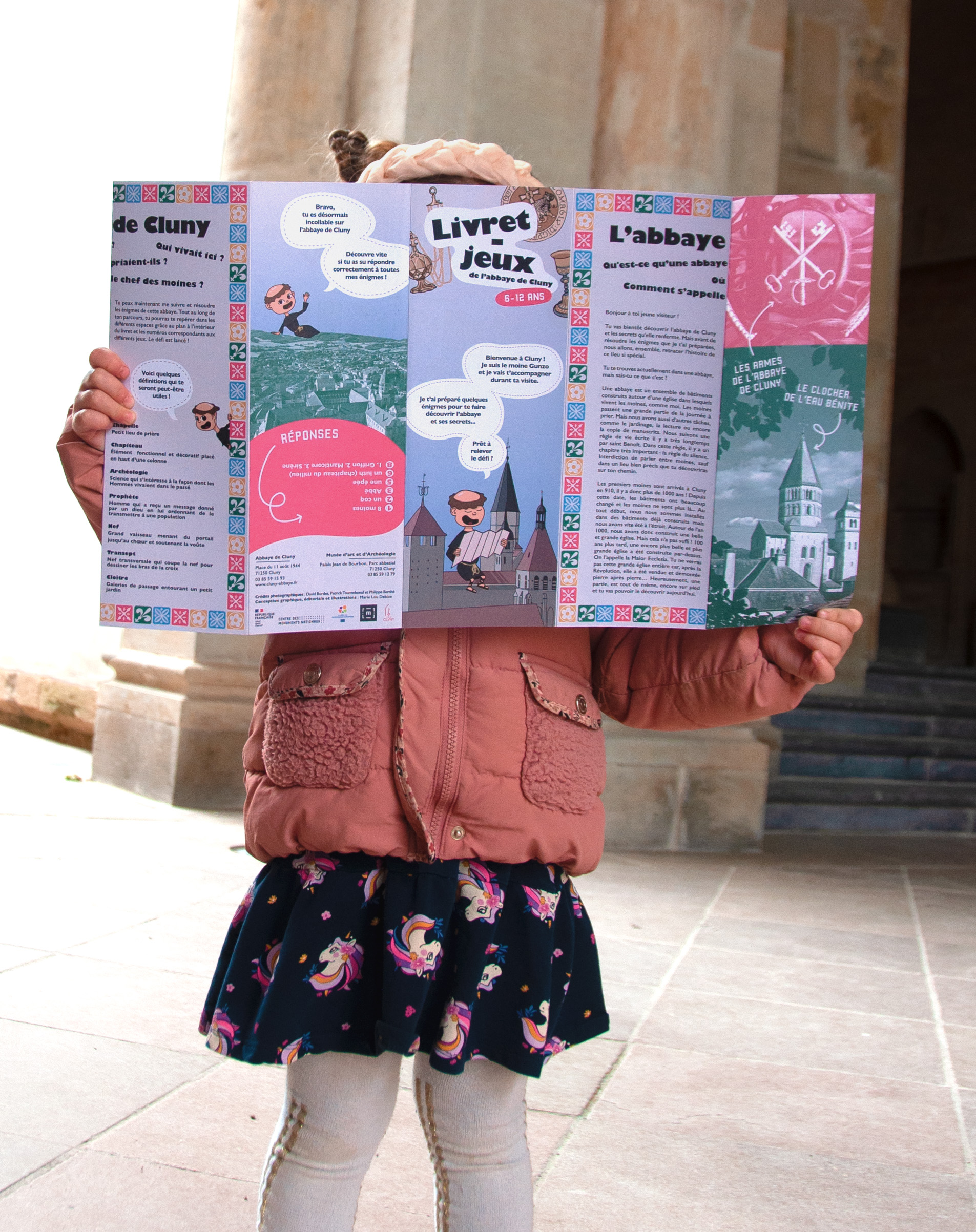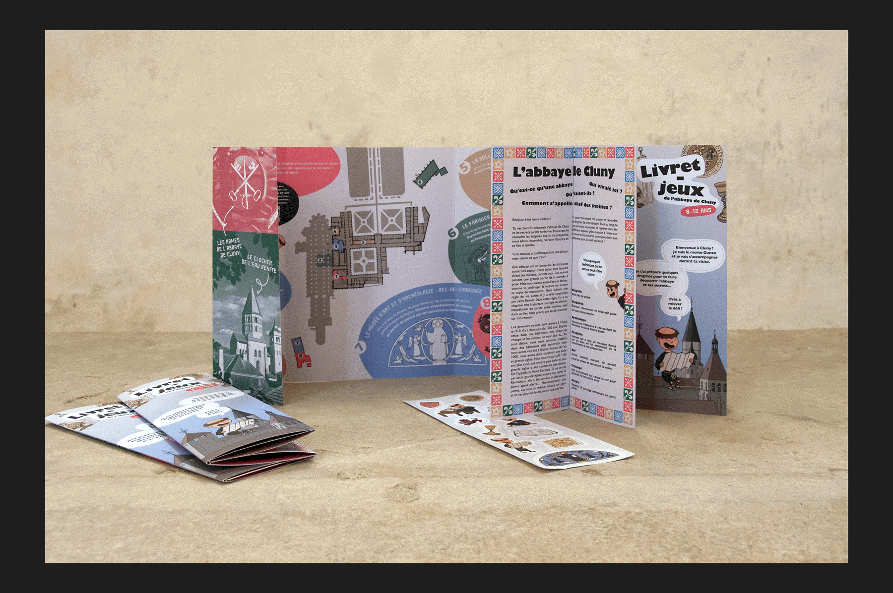 Conception graphique et éditoriale d’un livret-jeux à destination des enfants en visites pédagogiques, ou en famille, à l’abbaye de Cluny, lieu référencé au centre des monuments nationaux. Création d’illustrations pour la plaquette d’autocollants intégrée au livret.